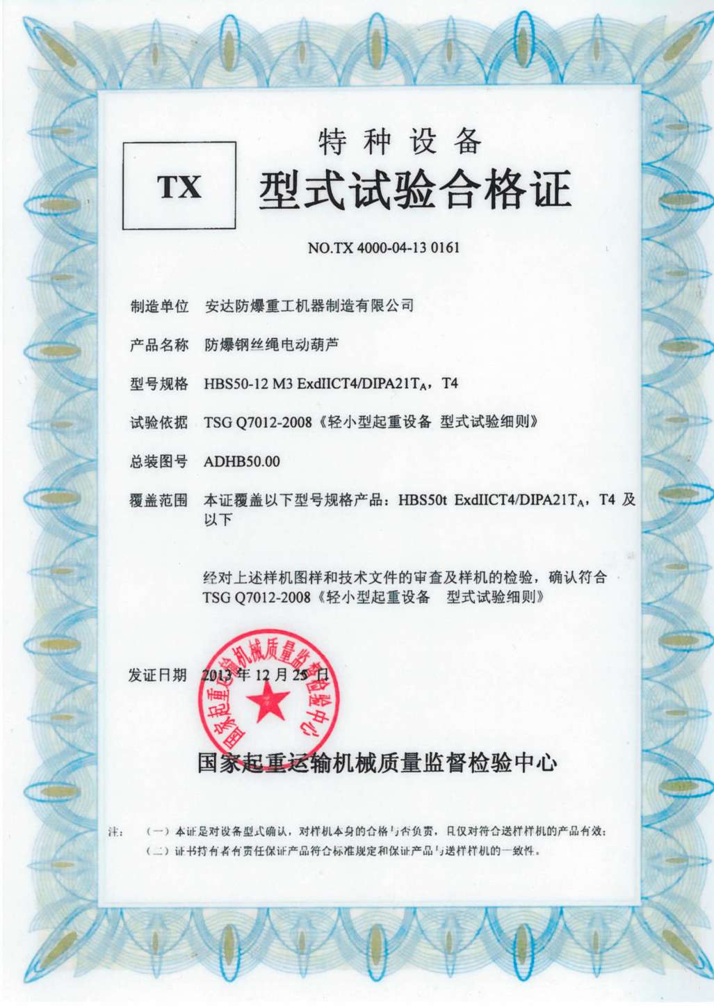 榮譽資質(zhì) 防爆鋼絲繩電動葫蘆 TX型式試驗合格證