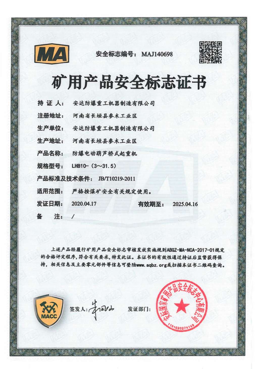 榮譽資質(zhì) 防爆鋼絲繩葫蘆橋式起重機 礦用產(chǎn)品安全標志證書