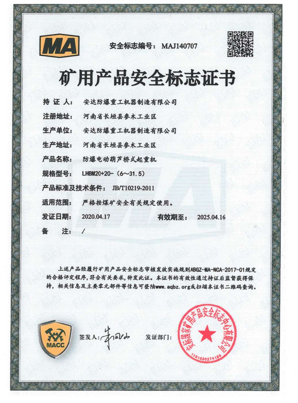 發(fā)證機構: | 安標國家礦用產(chǎn)品安全標志中心有限公司 | 發(fā)證時間 : | 2020-04-17 |