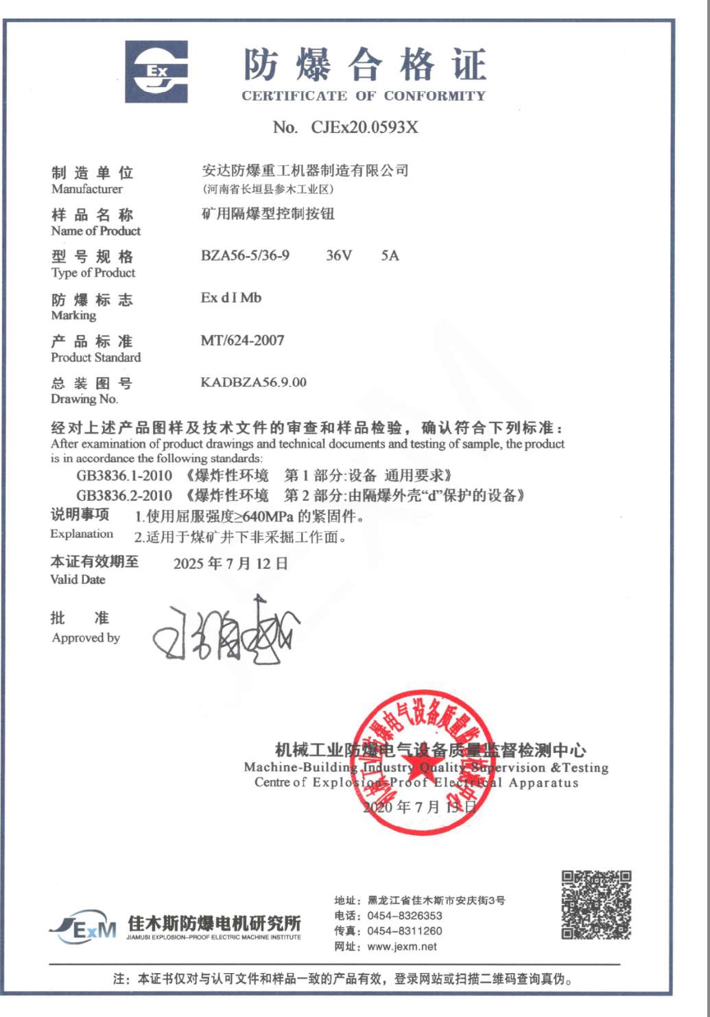 發(fā)證機(jī)構(gòu): | 機(jī)械工業(yè)防爆電氣質(zhì)量監(jiān)督檢測(cè)中心 | 發(fā)證時(shí)間 : | 2020-07-13 |