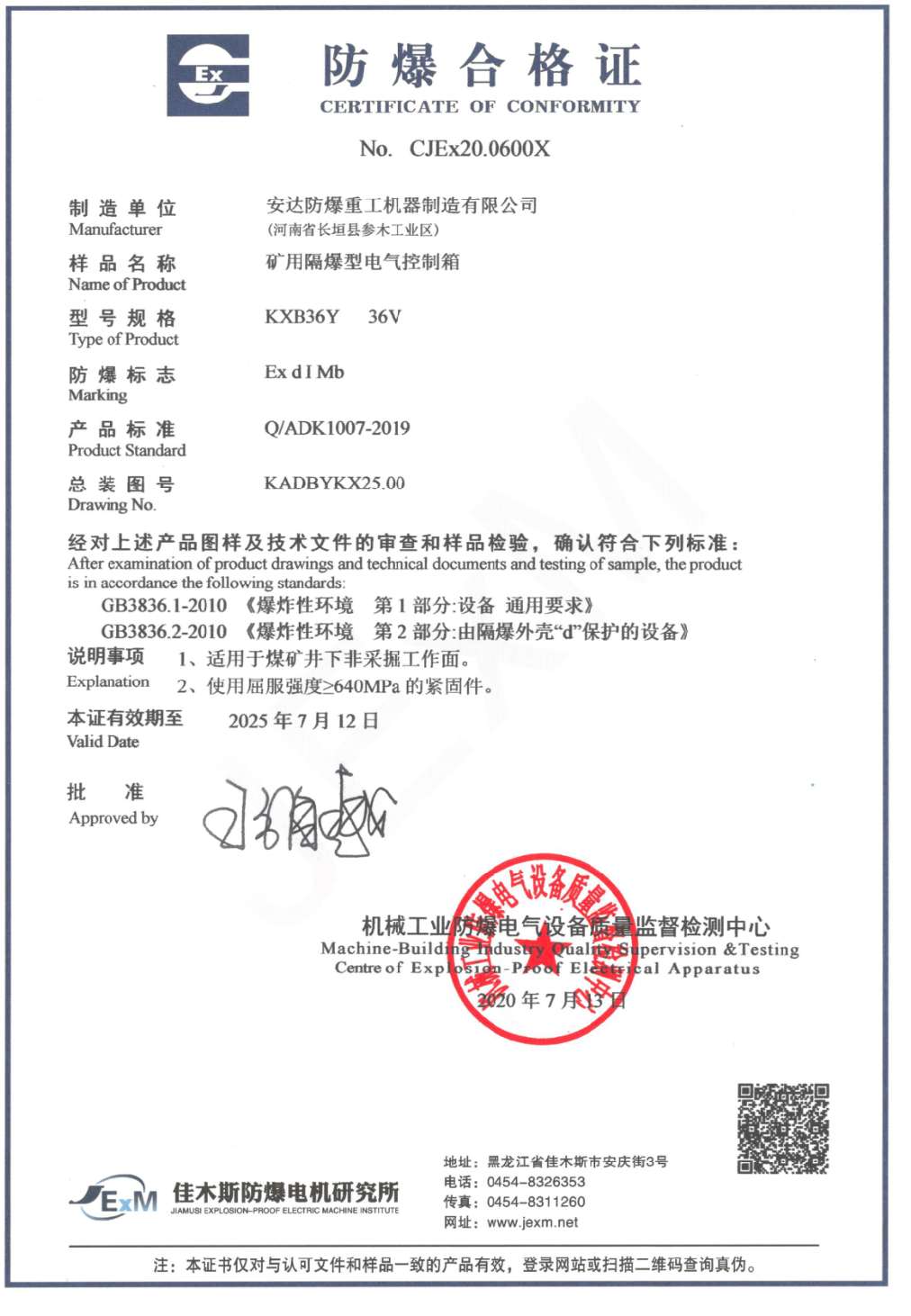 發(fā)證機(jī)構(gòu): | 機(jī)械工業(yè)防爆電氣質(zhì)量監(jiān)督檢測中心 | 發(fā)證時間 : | 2020-07-13 |
