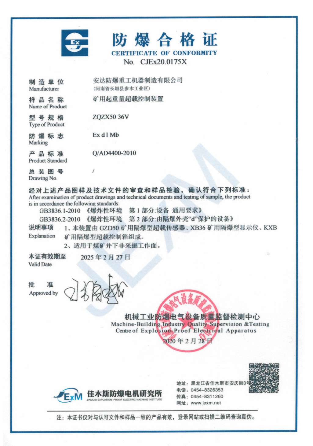 發(fā)證機構(gòu): | 機械工業(yè)防爆電氣設(shè)備質(zhì)量監(jiān)督檢測中心 | 發(fā)證時間 : | 2020-02-28 |