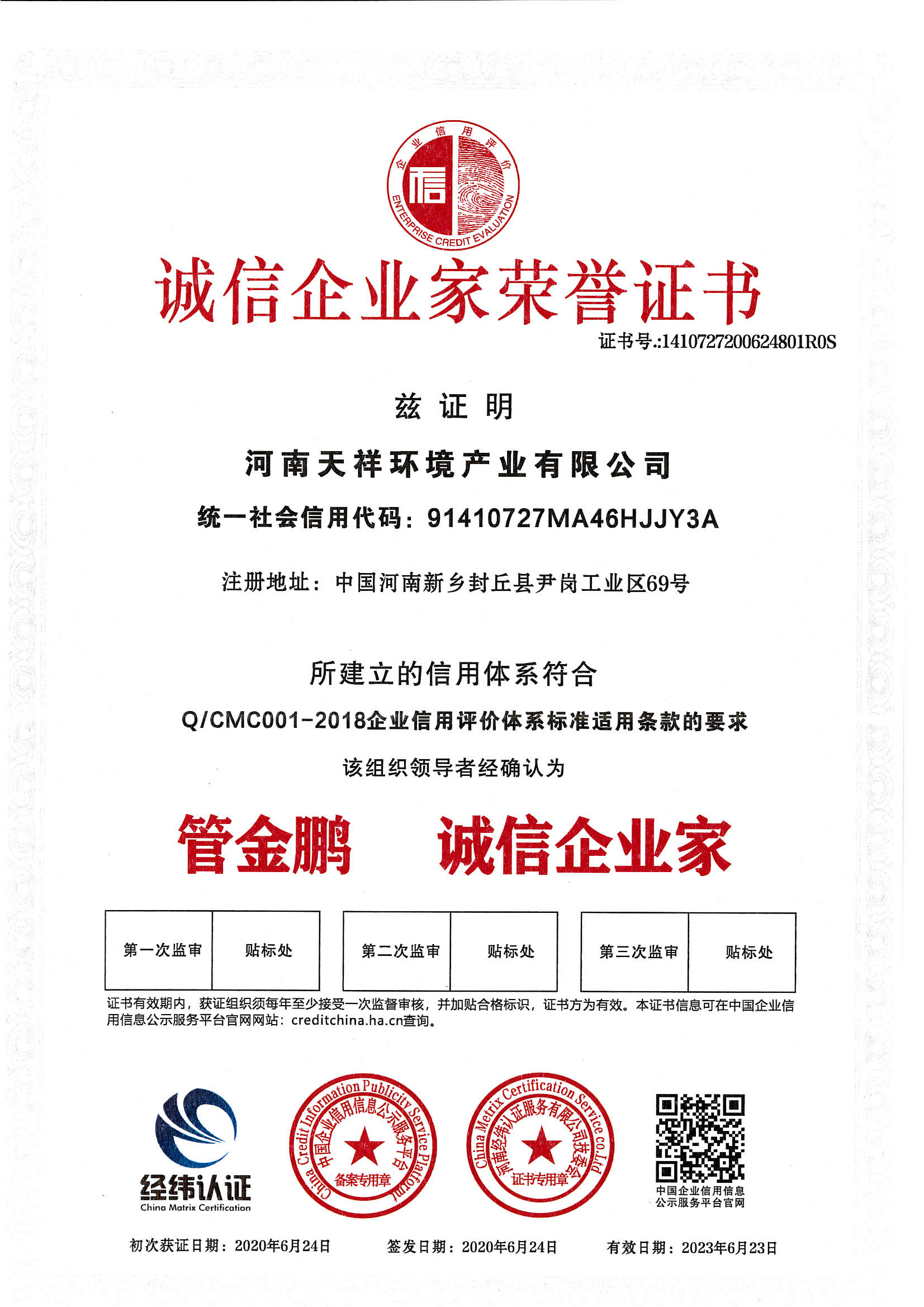 榮譽(yù)資質(zhì) 誠信企業(yè)家榮譽(yù)證書