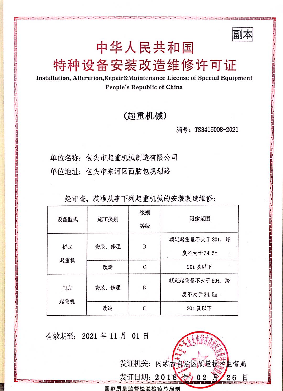 發(fā)證機(jī)構(gòu): | 內(nèi)蒙古自治區(qū)質(zhì)量技術(shù)管理局 | 發(fā)證時(shí)間 : | 2018-02-26 |