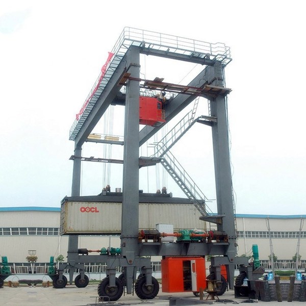 - 有懸臂軌道式集裝箱門式起重機(jī):這種起重機(jī)的結(jié)構(gòu)比較復(fù)雜,因?yàn)榧b箱必須通過門腿內(nèi)空間。它的小車運(yùn)行速度較高,一般設(shè)有減搖裝置。它可以在兩側(cè)或一側(cè)設(shè)置懸臂,以適應(yīng)不同的堆場布局。