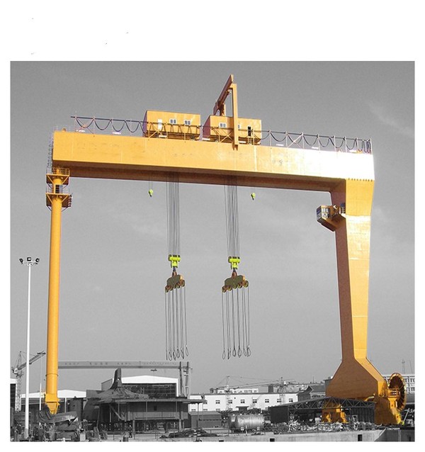 - 普通龍門起重機:這種起重機多采用箱型式和桁架式結(jié)構(gòu),用途廣泛,可以搬運各種成件物品和散狀物料,起重量在100噸以下,跨度為4~39米。