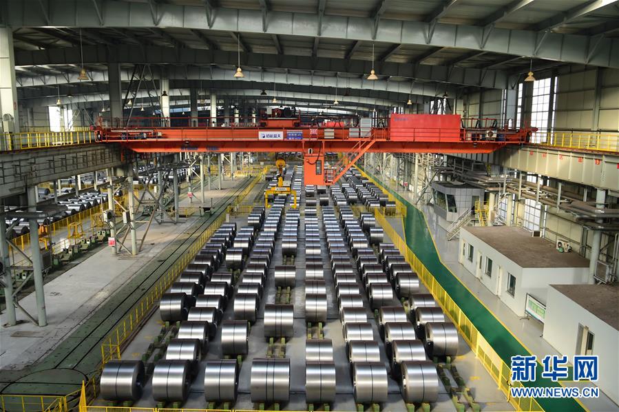 無人吊車在包鋼集團稀土鋼板材廠冷軋軋后庫夾取鋼卷(2019年11月7日攝)。新華社發(fā)(李志鵬 攝)