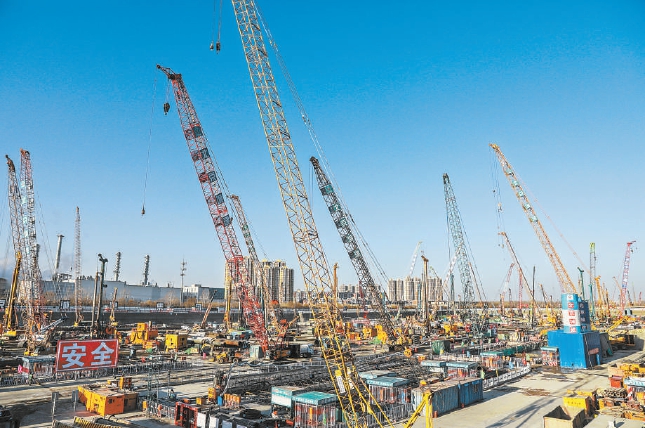 城市副中心站綜合交通樞紐施工現(xiàn)場塔吊林立、機(jī)器轟鳴,一派熱火朝天的建設(shè)景象。