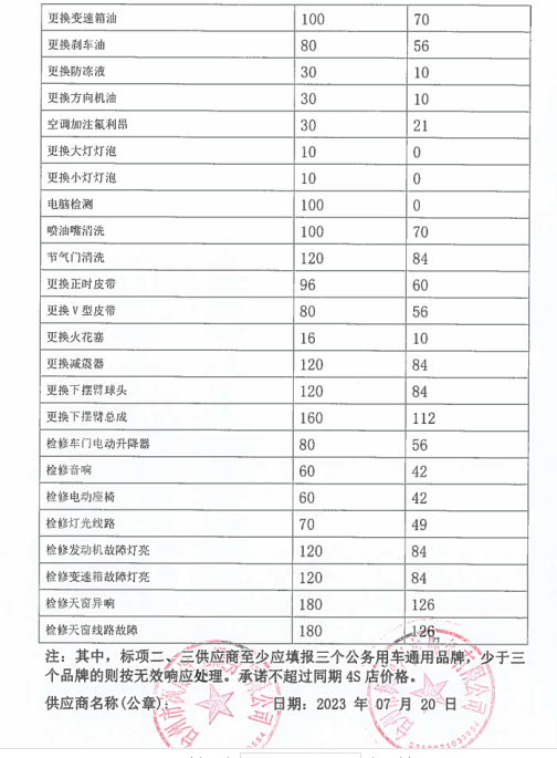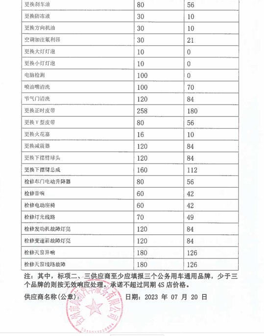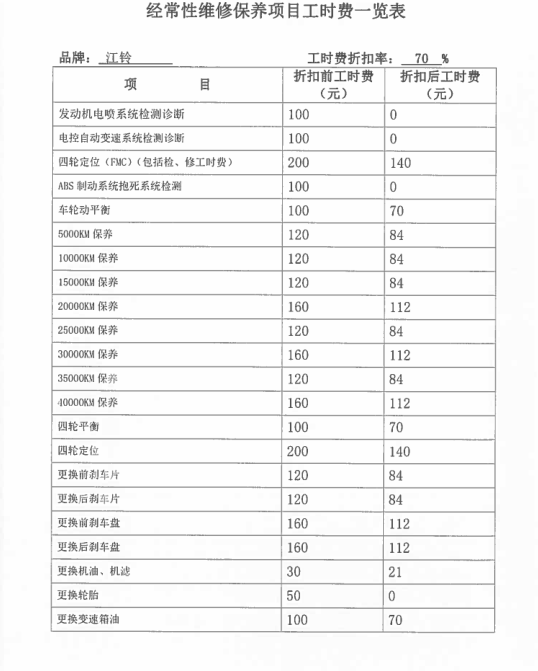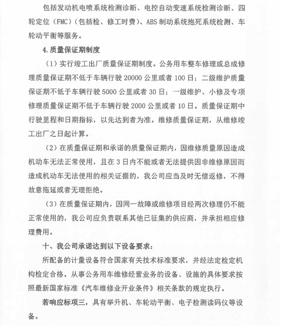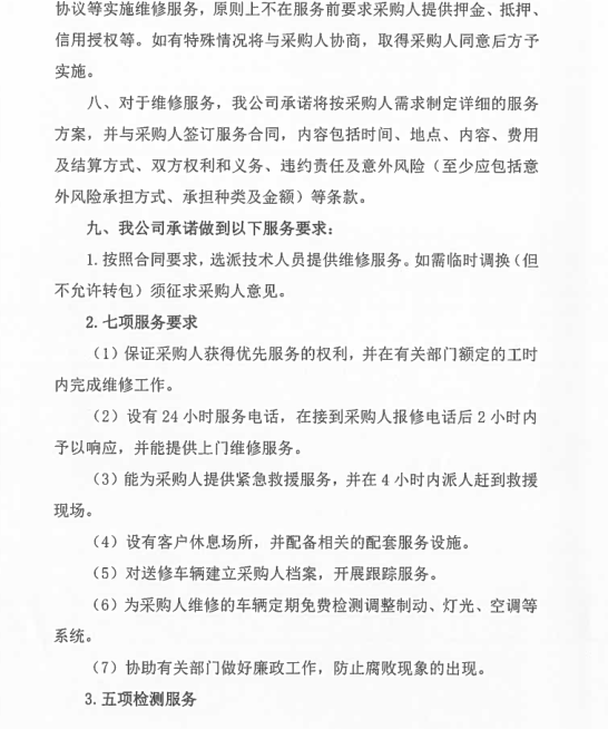 一、定點維修保養(yǎng)服務(wù) 1、承諾維修時限:大修7天內(nèi);二級維護2天內(nèi);一級維護1天內(nèi)完成。 2、設(shè)有24小時服務(wù)電話:0576-88530391 15868698695及提供服務(wù),并能為送修方提供緊急救援搶修服務(wù),在臺州市15公里范圍內(nèi)半小時內(nèi)派人趕到救援現(xiàn)場,臺州范圍內(nèi)非城區(qū)和標段區(qū)域外2小時內(nèi)派人趕到救援現(xiàn)場。 3、椒江城區(qū)免費拖車及施救。 4、為甲方定期保養(yǎng)的車輛免費辦理車檢服務(wù)。 5、車輛基礎(chǔ)裝潢,改裝裝璜服務(wù):更換各種舒適航空座椅、重新包座椅、星空頂或者其他車頂、手動電動窗簾、重包內(nèi)飾板、實木地板、改裝移動辦公用車等。也可根據(jù)貴單位實際需求改裝。 6、對甲方的送修車輛建立用戶檔案,做到“一車一檔”,開展跟蹤服務(wù)、提醒服務(wù)。每月5號前及時更新數(shù)據(jù)并上報甲方車輛管理員。 二、其它服務(wù)承諾 1、為定點維修單位客戶提供“宅捷修”服務(wù),(專業(yè)技師及服務(wù)顧問上門接修和估價,回廠進一步檢查報價,客戶確認后維修,經(jīng)技師自檢、互質(zhì)檢員完檢檢驗完美送車)。 2、公司本部在臺州市經(jīng)中路1015號,在黃焦濱海設(shè)有分部,為公務(wù)用車提供方便快捷的服務(wù) 3、事故出險承諾全程免費協(xié)助事故查勘、定損、理賠等服務(wù) 4、提供免費洗車服務(wù) 5、事故車維修除不可控因素外的維修時間,可根據(jù)需要提供代步車 6、事故出險乙方可以提供車輛接送服務(wù),也可提供代步車。 7、在我公司維修車輛的,無論維修多少維修時長,都可提供代步車服務(wù)。 8、承諾甲方員工的私人車輛按自愿的原則到乙方維修保養(yǎng)。員工的車輛同等享受中選結(jié)果的價格、服務(wù)條款,費用由員工自行支付。 9、享受每年2次的車輛安全檢測,同時提供與車輛節(jié)能使用、安全駕駛等相關(guān)事項的愛車課堂講座。 10、免費代辦車輛報廢服務(wù)(包括協(xié)議單位私家車)。 11、協(xié)議單位私家車維修憑工作證免工時(鈑金油漆打五折)一次。 12、提供送水、搭電、換胎等服務(wù) 13、代為貴單位質(zhì)保期內(nèi)車輛的首保索賠及其他需回原廠維修事務(wù) 14、免費更換玻璃水含材料 15、設(shè)有24小時技術(shù)服務(wù)電話:88530391、88530392、15868698695??蛻艨赏ㄟ^電話對車輛維修檔案、技術(shù)參數(shù)、故障、性能、年檢等車輛有關(guān)情況進行咨詢。 16、為更好的全面周到的服務(wù)于協(xié)議單位,我司可根據(jù)協(xié)議單位車輛規(guī)模提供升降機,安裝在協(xié)議單位提供的維修場地。并配備一定量的維修工具及常用配件。 17、我司還可根據(jù)協(xié)議單位維修量需要派駐點人員。 18、本公司可為協(xié)議單位提供的特色服務(wù),可為協(xié)議單位安裝公司維修管理軟件的客戶端,可使協(xié)議單位實時了解車輛維修情況。其具有強大的查詢功能,并且可通過因特網(wǎng)實時更新貴單位在本公司的維修等情況的數(shù)據(jù)。具體介紹如下: 維修管理軟件客戶端的詳細介紹 本公司的維修管理軟件不但可以對在本公司維修的車輛進行維修管理,公司通過聯(lián)網(wǎng)電腦對客戶的維修進行全程、系統(tǒng)的管理。從進廠區(qū)到竣工出廠的每一環(huán)節(jié)都通過微機間的數(shù)據(jù)傳遞進行管理,并保存每一環(huán)節(jié)的車輛維修等情況的實時記錄。為客戶建立了車輛基本情況、運行狀況及維修歷史、實時情況、客戶需要等的詳細完備的檔案資料。能根據(jù)不同客戶需要隨時、快捷地調(diào)閱車輛的各類檔案及統(tǒng)計資料。 還可為貴單位建立客戶端,可通過因特網(wǎng)將貴單位在本公司的車輛維修情況等數(shù)據(jù)導(dǎo)入貴單位自已的電腦上。 客戶端具有主控端一樣的功能,可查詢車輛的基本情況、維修歷史、實時的情況;也可查詢單輛車單次、多次的維修情況;也可統(tǒng)查某一輛車的所有維修情況、所有更換的配件情況;還可根據(jù)不同的時間段、不同的車屬單位進行查詢等。 本公司客戶端軟件查詢對話如下: